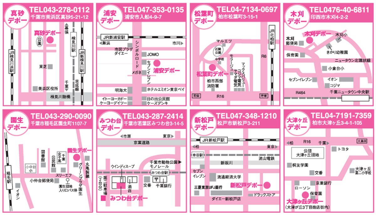 | デポー名 | 松葉町 | 大津ヶ丘 | 新松戸 | みつわ台 | 浦安 | 木刈 | 真砂 | 園生 |